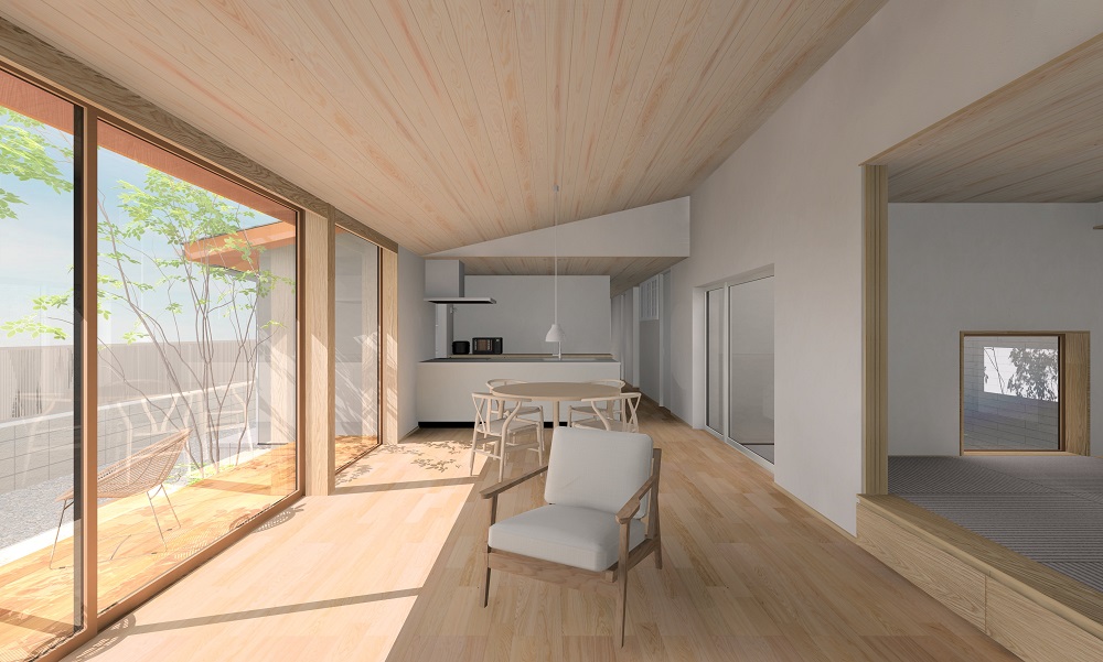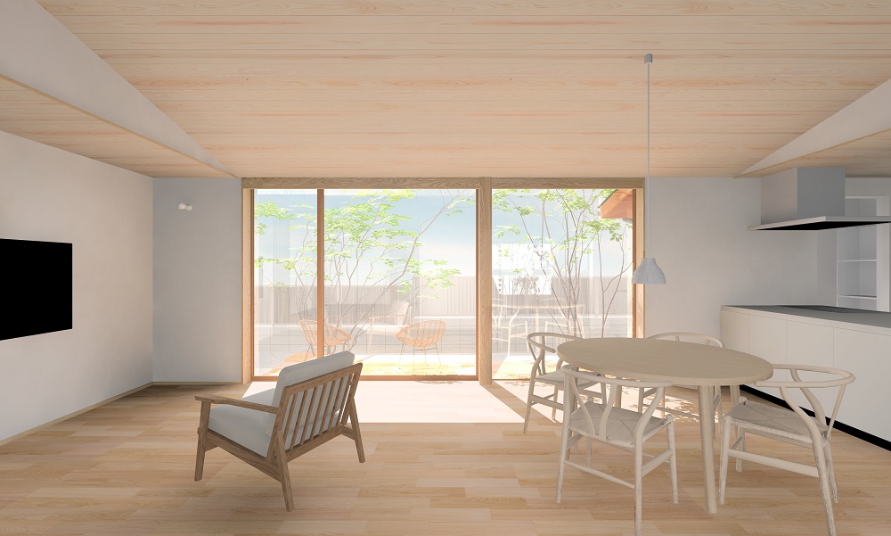 コの字型の間取りとし、中庭に面した大きな窓を設けています。