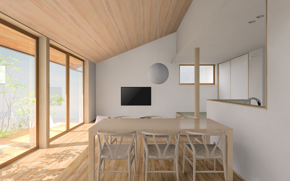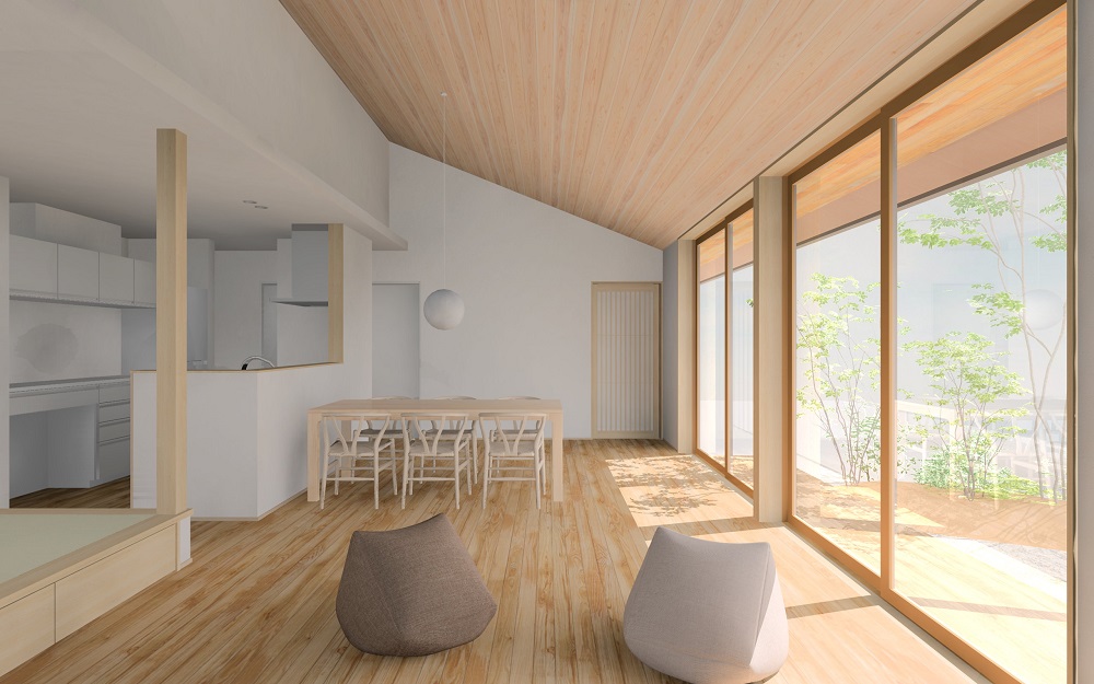 リビングの勾配天井が、縁側デッキの深い軒下空間につがっていく開放的な雰囲気の平屋建てのお住まいです。
